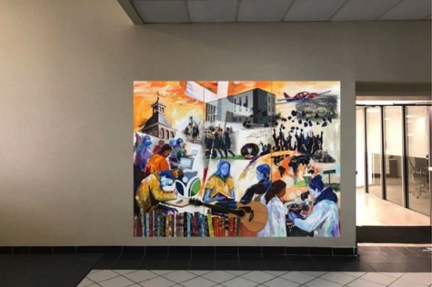 "This pemanent artwork is made up of three 36” x 78” panels and fills a 9 ft x 6.5 ft wall. It is displayed in a busy central location on-campus where students come to take classes and enjoy a Pilots’ game in the nearby gymnasium. The work of art created for Providence shows a visual narrative of the Impact 2020 journey. It beautifully depicts our Otterburne campus and includes the iconic belltower. It shows the interplay of academics and spiritual life. It highlights different programs and showcases students – students at study and in classes, as well as students playing sports, making music, and graduating." Samantha Groenendijk, VP External Relations.